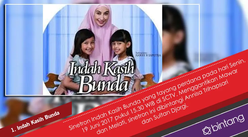 Fimela.com, Jakarta SCTV menghadirkan sinetron baru hari ini Senin, 19 Juni 2017. Sinetron baru berjudul Indah Kasih Bunda menjadi andalan baru untuk menanti saat berbuka puasa. Sinetron ini menggantikan sinetron Mawar dan Melati.