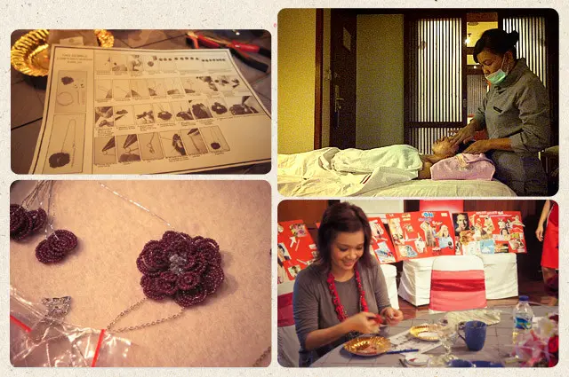 After all the beauty �hardwork� it�s time for some fun. Kita semua diajarkan oleh Elizabeth Wahyu sendiri untuk membuat liontin bunga mawar dari beads cantik. After a long, facts filled day, dimanjakan dengan facial dan pijat wajah Age Miracle Relaxing Anti-ageing treatment di kamar masing-masing jadi penutup yang sungguh menyenangkan. Bagi yang tertarik kamu bisa datang ke Pond�s institute mereka. We couldn�t think of any better way to end the day.