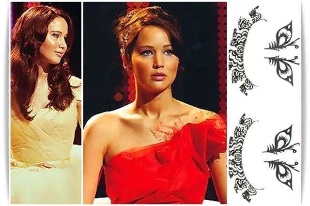 Berbeda dengan Effie Trinket, karakter Katniss Everdeen dalam film ini hadir dengan makeup yang lebih soft dan natural, terlebih selama game berlangsung. Namun kamu masih bisa mencuri trik makeup Katniss ketika berada dalam sesi interview dan coronation. Pada adegan interview pertama kalinya, Katniss dihadirkan dengan eyeshadow gold yang dikombinasikan dengan warna soft pink pada kelopak mata. Untuk menambah definisi mata, tambahkan pulasan reddish-purple eyeshadow agar tampilan tetap terlihat natural. Terakhir, berikan sentuhan lipstik soft pink dengan tambahan glossy agar tampilan terlihat lebih clean. Sedangkan pada adegan coronation ketika Katniss dan Peeta diwawancara sebagai pemenang, Katniss terlihat manis dengan Paperself Small Peacock Lashes pada sudut luar matanya. Sama seperti saat wawancara, pada adegan ini, bibir Katniss juga diberikan pulasan lipstik soft pink yang ditambah dengan lipgloss pink untuk hasil yang menawan.