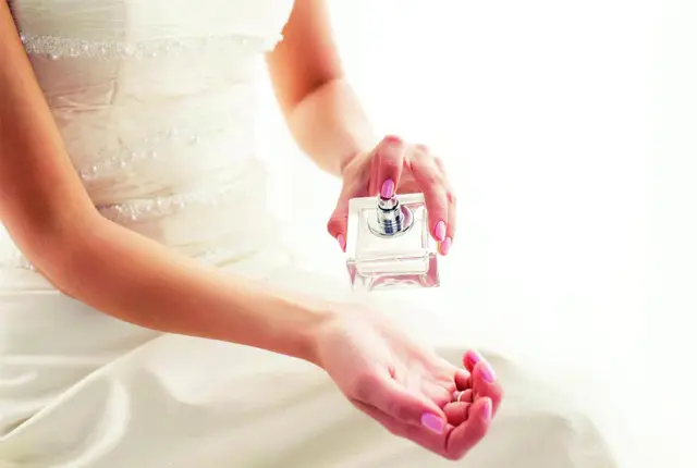 Semprotkan wewangian pada kulit secara langsung jangan langsung ke kebaya atau gaun pernikahan. Jenis kulit juga akan berpengaruh pada wangi parfum yang dikeluarkan. Kalau kamu memiliki kulit berminyak, bisa jadi wangi parfum yang disemprotkan akan terasa lebih intens daripada di tubuh yang berjenis kulit kering. Oleh karena itu untuk yang berkulit kering, kamu perlu menyemprotkan parfum berkali-kali karena wanginya memang akan lebih cepat hilang.