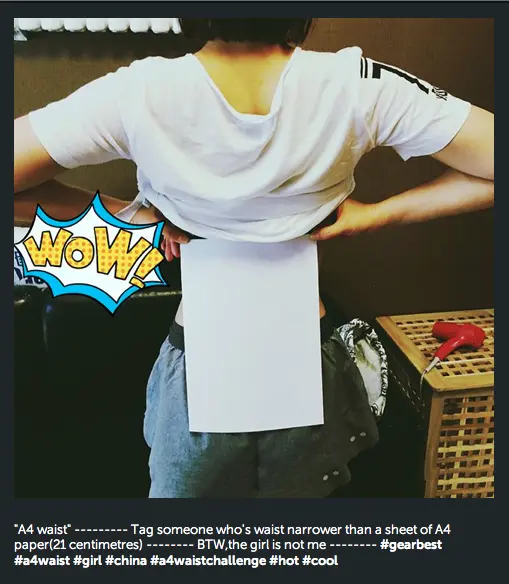 Pinggang berukuran sama dengan kertas A4? Terdengar nggak wajar, sih. Namun tren #A4WaistChallenge ini memang lagi happening banget di sana. Tujuan foto tersebut tentu saja untuk membanggakan diri, jika mereka berhasil mendapatkan tubuh langsing berukuran 21 cm ala kertas A4. Walaupun disebut sebagai tren, tetap saja fenomena ini meresahkan. Keinginan perempuan di Tiongkok yang ingin tampil super ramping tersebut dianggap sebagai “the unrealistic fitness trend.”