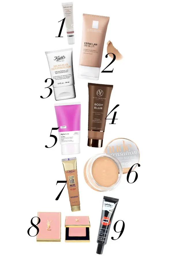 1. Balance Me Instant Lift Pore Minimiser, 2. La Roche-Posay Effaclar BB Blur, 3. Kiehls Micro Blur Skin Perfector, 4. Deciem Finisher HA Blur, 5. Vita Liberata Body Blur Instant Skin Finish, 6. Bourjois Nude Sensation Blur Effect Foundation, 7. L'OREAL Visible Lift Blur Foundation, 8. Yves Saint Laurent Touche Éclat Blur Perfector, 9. The YazBukey for Shu Uemura Stage Performer Smooth-Out Instant Pore Blurring Primer