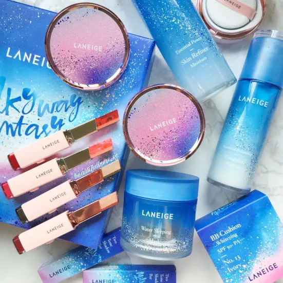 Musim liburan dan natal tahun ini, Laneige merilis produk kecantikan edisi liburan, bertema Milkyway Fantasy. Di dalam kemasan kamu akan menemukan daily basic care produk terbaik Laneige, seperti Essential Powerskin Refiner Moisture, Essential Balancing Emulsion Moisture, Water Sleeping Mask, Water Bank Essence, Water Bank Moisture Cream. Psst, produk ini sekaligus untuk anti-aging juga lho.