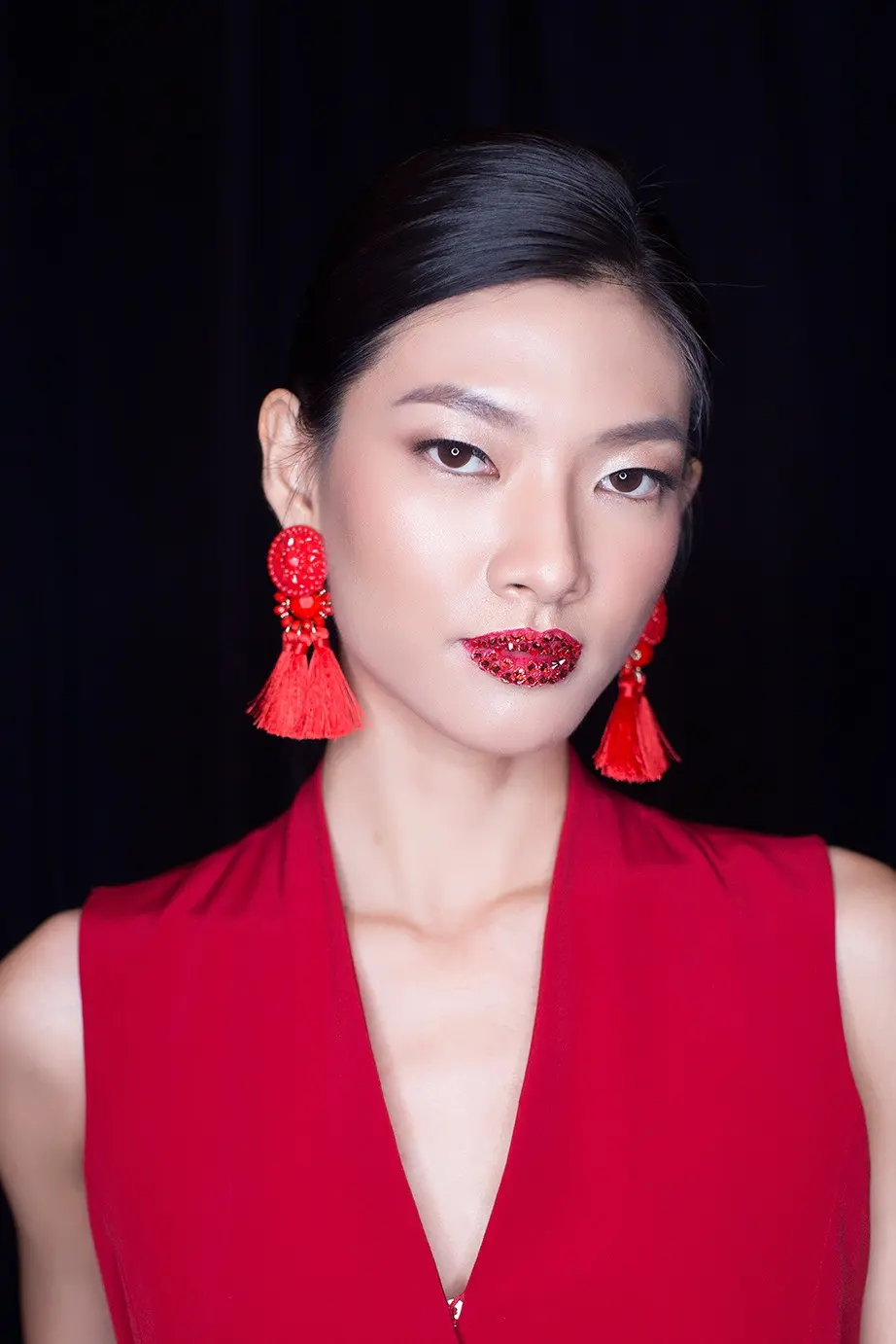 Fokus pada makeup bibir. Well, untuk gaya riasan satu ini, mungkin terlihat sedikit berlebihan. Tapi, buat kita yang senang tampil beda dan berani mencoba sesuatu yang baru, lipstik merah bertabur kristal di bibir ini bisa jadi inpirasi makeup yang dipertimbangkan. Tips, karena malam tahun baru Imlek adalah momen sakral, sentuhan makeup “tidak terlalu menor” tetap harus menjadi catatan penting kita.