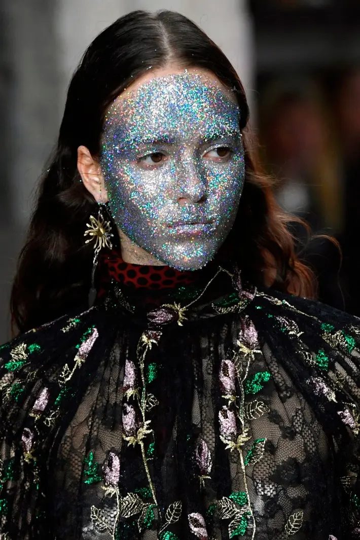 Dari dahi, mata, pipi, hidung, sampai dagu, semuanya bertaburbubuk glitter berwarna-warni yang memantulkan cahaya saat terkena lampu. Look makeup milik Giambattista Valli ini sungguh menjadi pemandangan makeup yang paling berbeda dari look makeup runway biasanya, seperti glamor, flawless, bare faced, atau bold makeup.