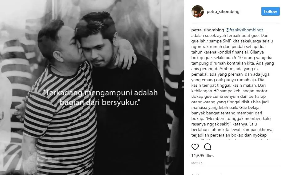 "Bokap gue bukan nirmala. Dia nggak sempurna, dia manusia. Orang cenderung lebih tertarik kepada hal negatif dibanding yang positif. Dari 9 hal baik, kemungkinan besar 1 hal buruk bisa melalaikan penilaian kita terhadap sesuatu. Atau seseorang. Gue siapa bisa menghakimi orang lain? Manusia bisa mengampuni, karena nggak ada satupun manusia yang sempurna. Satu hal yang gue tau pasti adalah, bokap gue sempurna di mata gue. Thank you pa buat semuanya. Love you," imbuh Petra.