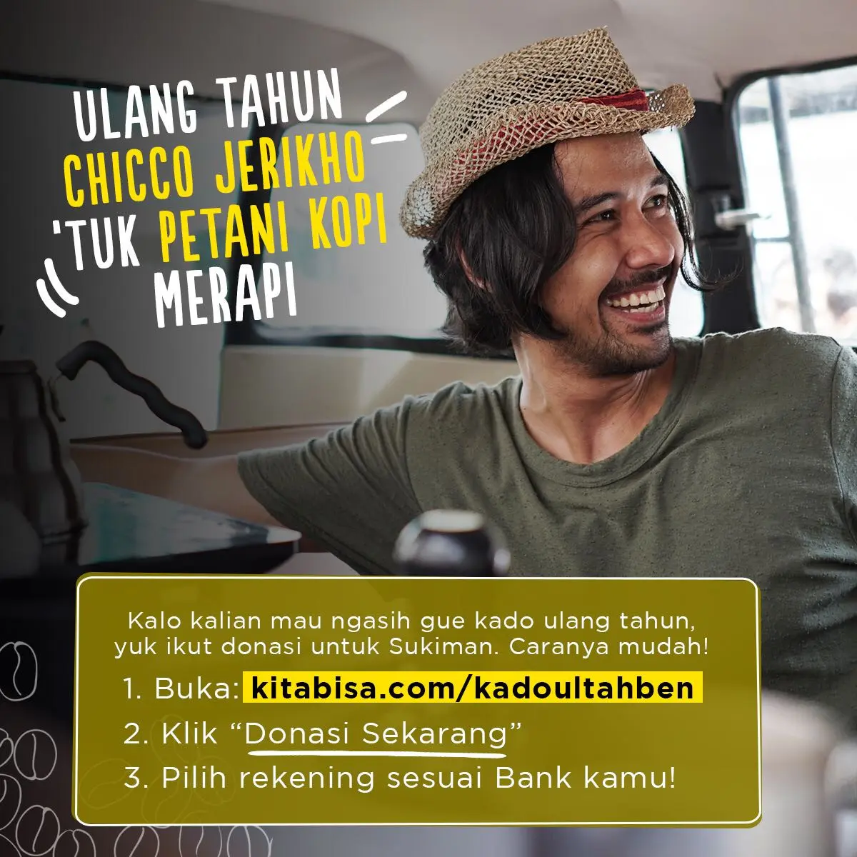 "Kebetulan gue dengar cerita tentang Kopi Tanah Air Kita yang lagi mau ngebantu Kang Sukiman untuk memberdayakan Petani Kopi Merapi. Gue ngerasa terpanggil buat ikutan take action barengan sama kalian,oleh karenanya gue minta dikasih kado donasi buat petani kopi Indonesia. Lo semua pasti tau, kalo Gue Ngga Pernah Bercanda Soal Kopi," tulis Chicco dalam keterangan kampanyenya di Kitabisa.com.