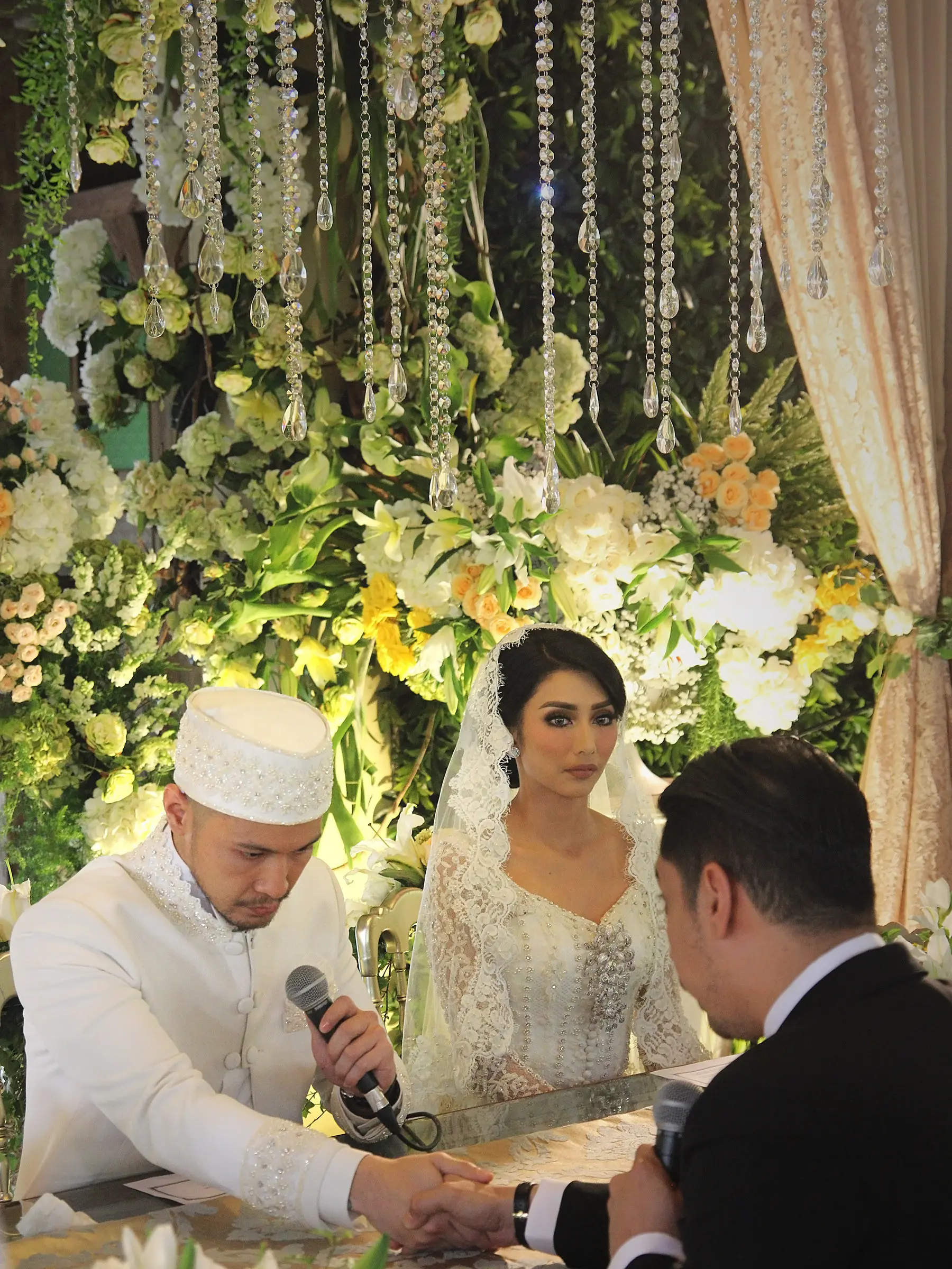 "Saya terima nikah dan kawinnya Mirasih Tyas Endah binti Sirman Widiatmo dengan mas kawin perhiasan emas 8 gram tunai," timpal Raiden Soedjono.