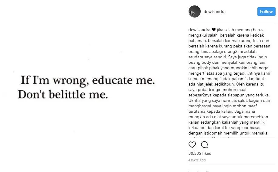 "Intinya, kami semua memang "tidak paham" dan tidak ada niat jelek sedikitpun. Oleh karena itu, saya pribadi ingin mohon maaf sebesar-besarnya kepada siapapun yang terluka," lanjut Dewi.