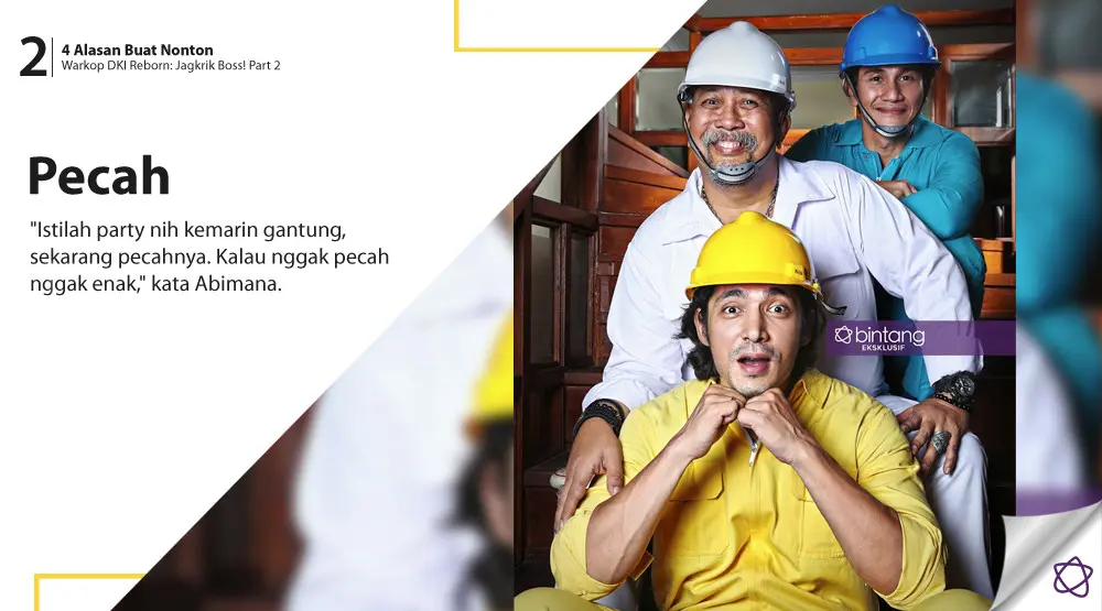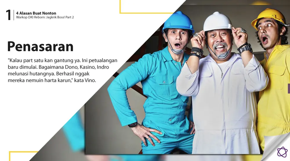 Film Warkop DKI Reborn 2 ini bercerita tentang petualangan trio Warkop DKI ke sebuah pulau angker di Malaysia demi mendapatkan harta karun untuk melunasi hutang mereka. Dari kisah petualangan mereka, cerita lucu pun tak berhenti mengocok perut penonton sepanjang film. Berikut 4 Alasan Buat Nonton Warkop DKI Reborn: Jagkrik Boss! Part 2.
