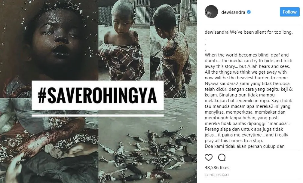 Di bagian akhir tulisannya, Dewi Sandra memberi tagar #saverohingnya #burma #myanmar#rohingnya #genocide #muslim. Sejumlah netizen yang melihat gambar dan membaca keterangan Dewi pun ikut berduka. "ðŸ˜ðŸ˜”sedih sekali gak bisa bantu mereka," tegas akun @rininurhidayati.