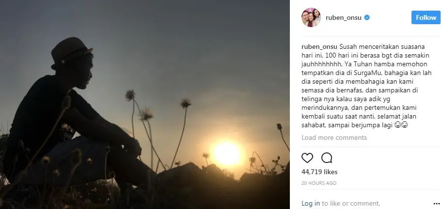 "100 hati tanpa sahabat, dan kemarin sebelum kerja ke Bali mampir dulu ke tempat istirahat, selamat jalan sahabat, kangen 🙏🙏🙏🙏," kata Ruben, Minggu (17/9/2017).