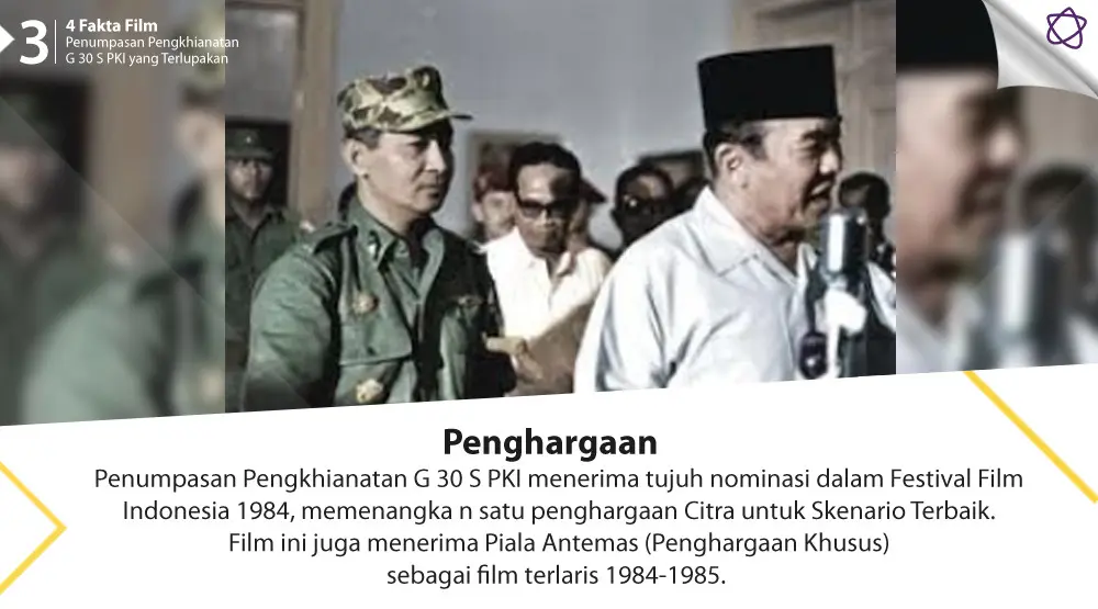 Film Penumpasan Pengkhianatan G 30 S PKI dibuat berdasarkan pada versi peristiwa kudeta yang diakui oleh pemerintah Orde Baru Soeharto, di mana kudeta Gerakan 30 September didalangi oleh Partai Komunis Indonesia atau PKI. Berikut 4 Fakta tentang film Penumpasan Pengkhianatan G 30 S PKI yang sering dilupakan.
