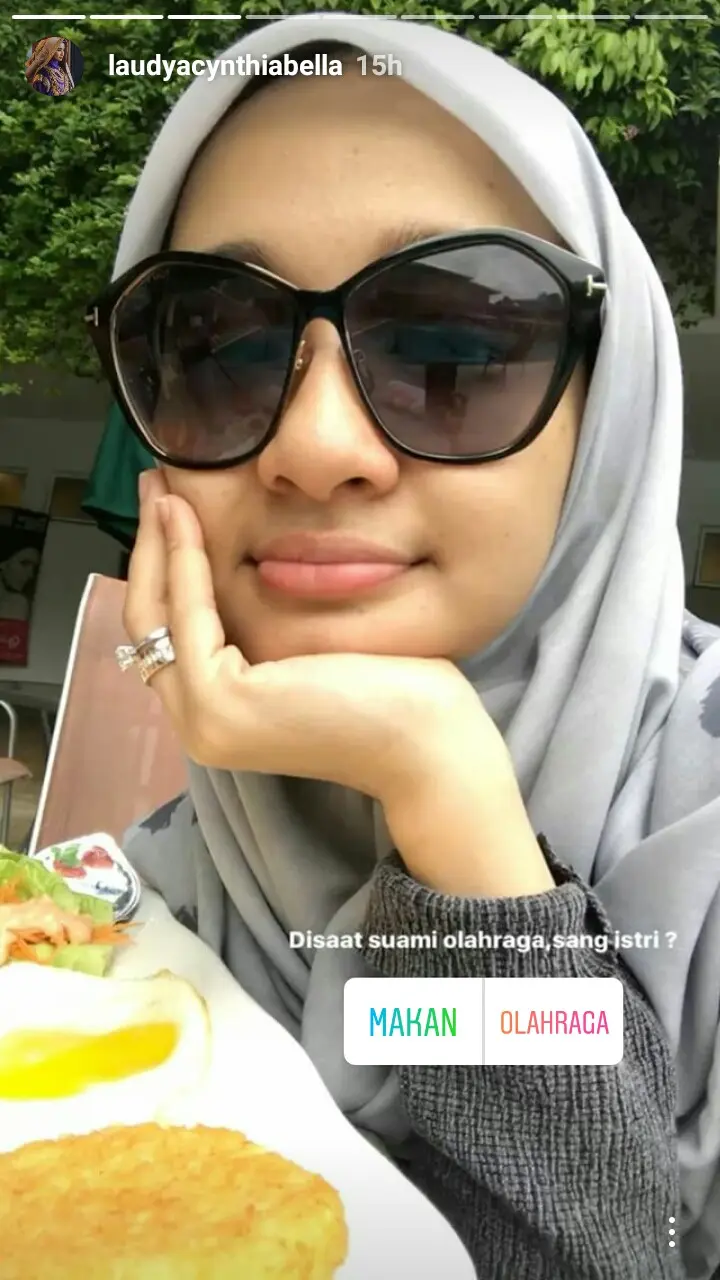 Laudya Cynthia Bella memamerkan fotonya saat sedang menunggu Engku Emran saat sedang berolahraga. Bella tampak cantik dengan memakai kacamata hitam. Ia sedang berpangku dagu.