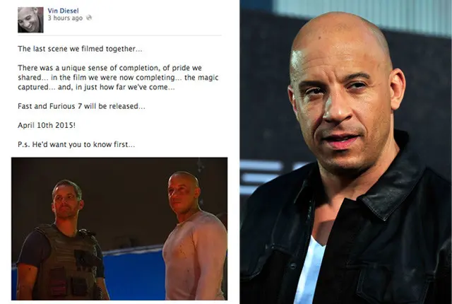 Setelah kematian Paul Walker 30 November lalu, seluruh tim produksi sekaligus aktor dan aktris memutuskan untuk berhenti syuting untuk waktu yang tidak ditentukan. Film Fast & Furious 7 awalnya dijadwalkan keluar di bioskop pada tanggal 11 Juli 2014 namun due to Paul's accident, everything changes. Minggu kemarin, salah satu bintang utama film Fast & Furious 7, Vin Diesel mengumumkan kalau film ini bakal keluar di bioskop April 2015! Lewat sosial media, Facebook, Vin Diesel menulis pesan dan bahkan menambahkan foto Paul Walker di samping tulisannya. "The last scene we filmed together.. there was unique sense of completion, of pride we shared in the film we were now completing.. the magic captured.. and, in just how far we've come. Fast and furious 7 will be released... April 10th 2015! P.S He'd want you to know first." Sempat sedih membacanya namun jika kamu penggemar film aksi ini wajib menonton the last role of Paul Walker.