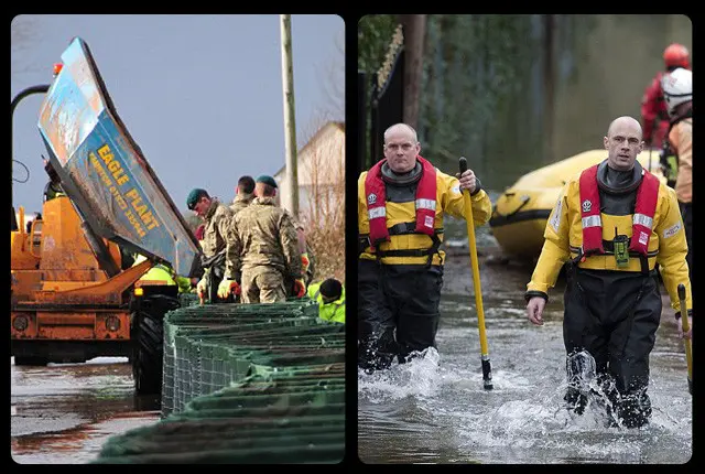Sebanyak 1.600 personel militer disiagakan untuk membantu warga. Beberapa bahkan telah mulai bekerja dengan menempatkan karung-karung berisi pasir di sepanjang sungai, terutama di wilayah Wraysbury. Juru bicara Departemen Pertahanan Inggris mengatakan telah mengusahakan para tentara –terutama dari Royal Marine, untuk membantu para korban di Somerset.