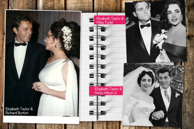 - Elizabeth tercatat pernah menikah 8 kali dengan 7 pria yang berbeda Nicky Hilton Jr, Michael Wilding, Mike Todd (meninggal karena kecelakaan pesawat), Eddie Fisher, Richard Burton (Liz menikah dua kali dengan Burton dan dia adalah cinta sejati Liz).