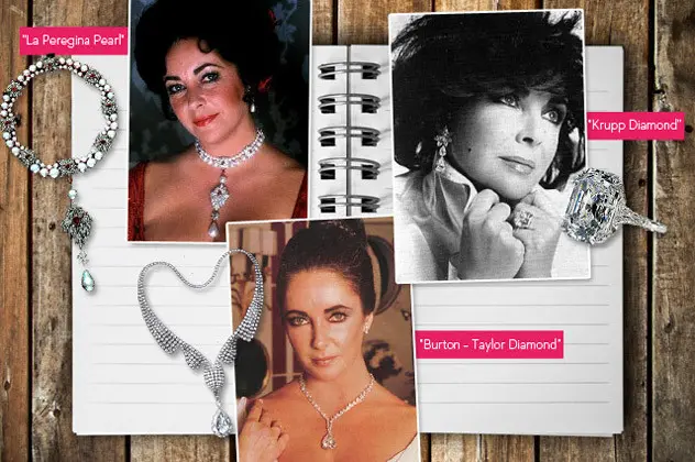 - Elizabeth memiliki koleksi perhiasan yang luar biasa antara lain “Krupp Diamond” sebesar 33 carat, The Duchess of Windsor diamond brooch, the Grand Duchess of Russia emeralds, the "La Peregina Pearl" dan yang paling siknifikan adalah cincin “Burton – Taylor Diamond” sebesar 69 carat. Setelah bercerai cincin itu di Auction dan laku seharga US$ 3 juta dan uangnya disumbangkan untuk membuat rumah sakit di Bostwana.