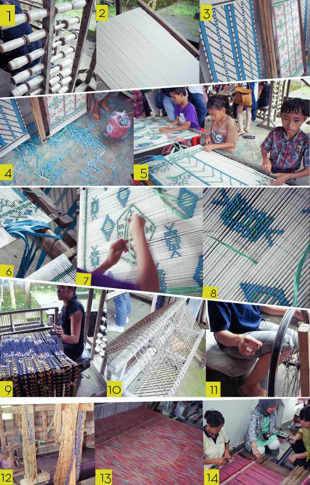 12+14+15. Satu demi satu kemudian benang ditenun, serat demi serat, helai demi helai. Untuk satu lembar biasanya dibutuhkan satu bulan.