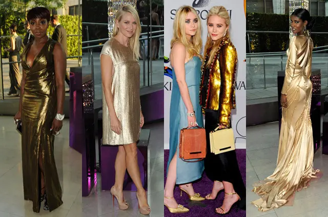 Jika warna emas sudah dipilih, biarkan aksesori pendukung dibuat minimalis agar tampilan terlihat balance dan tidak saling berebut atensi yang melihat. Naomi Watts dibalut gaun cocktail minimalis rancangan Calvin Klein Collection, Mary-Kate Olsen berbalu blazer emas rancangan The Row, Estelle dan Sessilee Lopez terlihat semakin eksotis dibalut gaun emas.