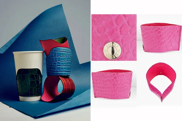 Jika biasa saat takeaway kopi panas kita diberikan cup holder secara gratis, kini Jimmy Choo dan Hermes menjual cup holder tersebut. Jimmy Choo melansir cup holder warna fuchsia dengan detail faux crocodile skin, sedangkan Hermes memberikan pilihan warna yang variatif dengan kulit buaya yang asli.