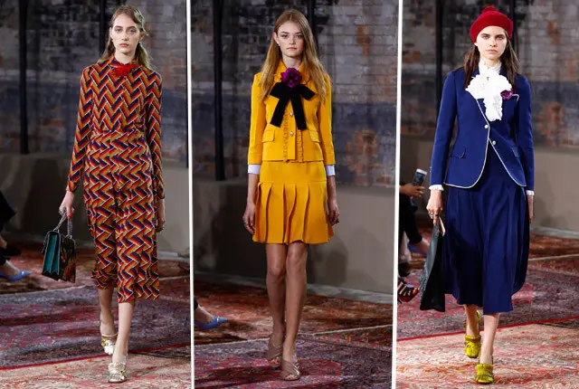 Di beberapa look, Alessandro Michele menciptakan gaya preppy, lengkap dengan blazer, kemeja putih berkerah bow tie, dan rok senada. Seperti membayangkan perempuan di tahun 70-an bereinkarnasi. Kemudian palet Gucci untuk koleksi Resort 2016 ini tidak terpaku pada warna tertentu. Bisa dikatakan hampir semua warna terlihat. Mulai dari yang vibrant hingga ke warna pastel. Di beberapa look terakhir, beberapa model juga mengenakan topi beret dan kacamata bening yang classy.