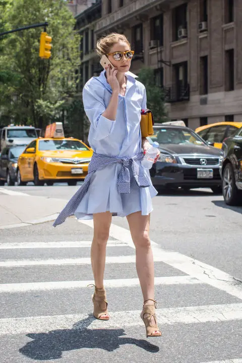 Pakai shirt dress bermotif pinstripes memang terkesan seperti piyama apalagi jika modelnya terlalu oversized. Untuk mengakalinya, tiru cara Olivia Palermo mengikatkan satu buah kemeja di bagian pinggang. Kemeja satu ini juga bisa menjadi alternatif ikat pinggang.
