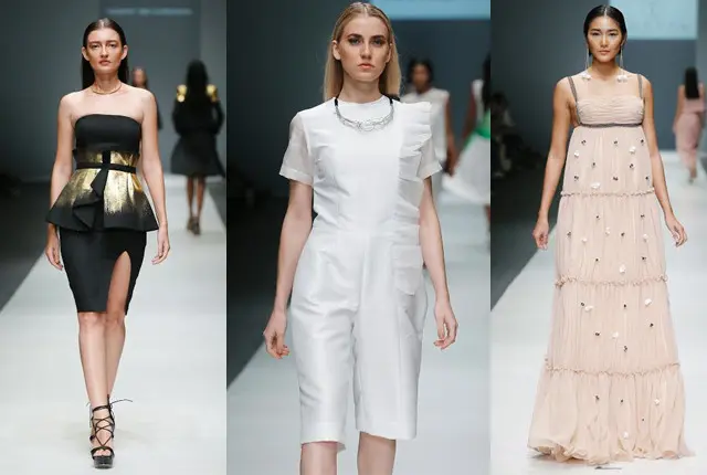 Mereka menuangkan garis-garis feminin pada little black dress, sequin dress, rok a line, bomber jacket , detil-detil bunga sampai casual outfit seperti celana pendek, jumpsuit dan juga celana panjang. Benang merah dari rancangan ketiganya adalah kesederhanaan yang tetap menampilkan karakter yang kuat.