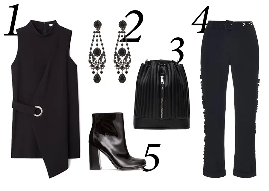 1. Asymmetrical Top, Mango | 2. Chandelier Earrings, Givenchy | 3. Bucket Backpack, ZARA | 4, Frayed Trousers, Preen by Thornton Bregazzi | 5. Patent Boots,