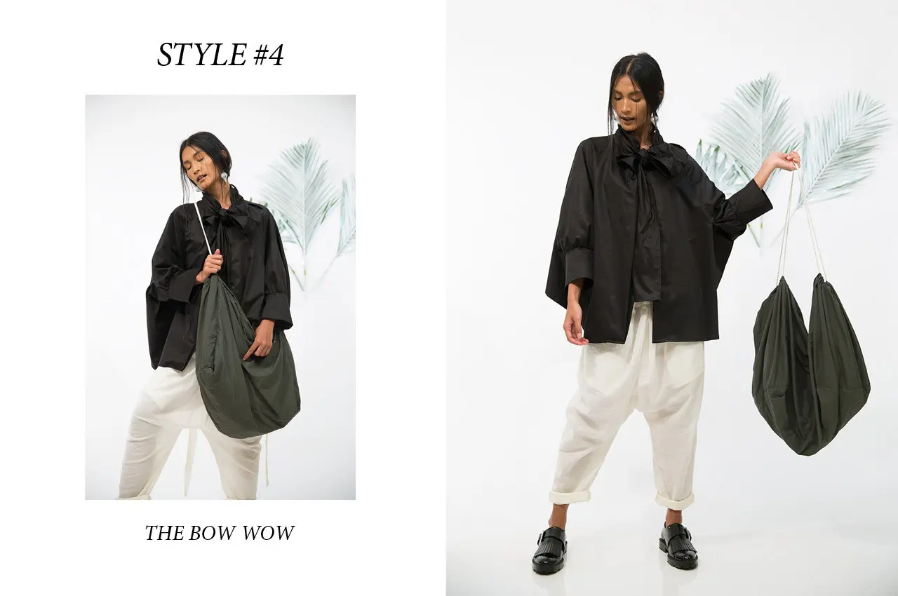 Bow Shirt, No’om @ Fashion First Jakarta | White Pants, Lulu Lutfi Labibi @ Fashion First Jakarta | Brogues, milik stylist | Parachute Bag, H&M | Marble Earrings, Massicot
