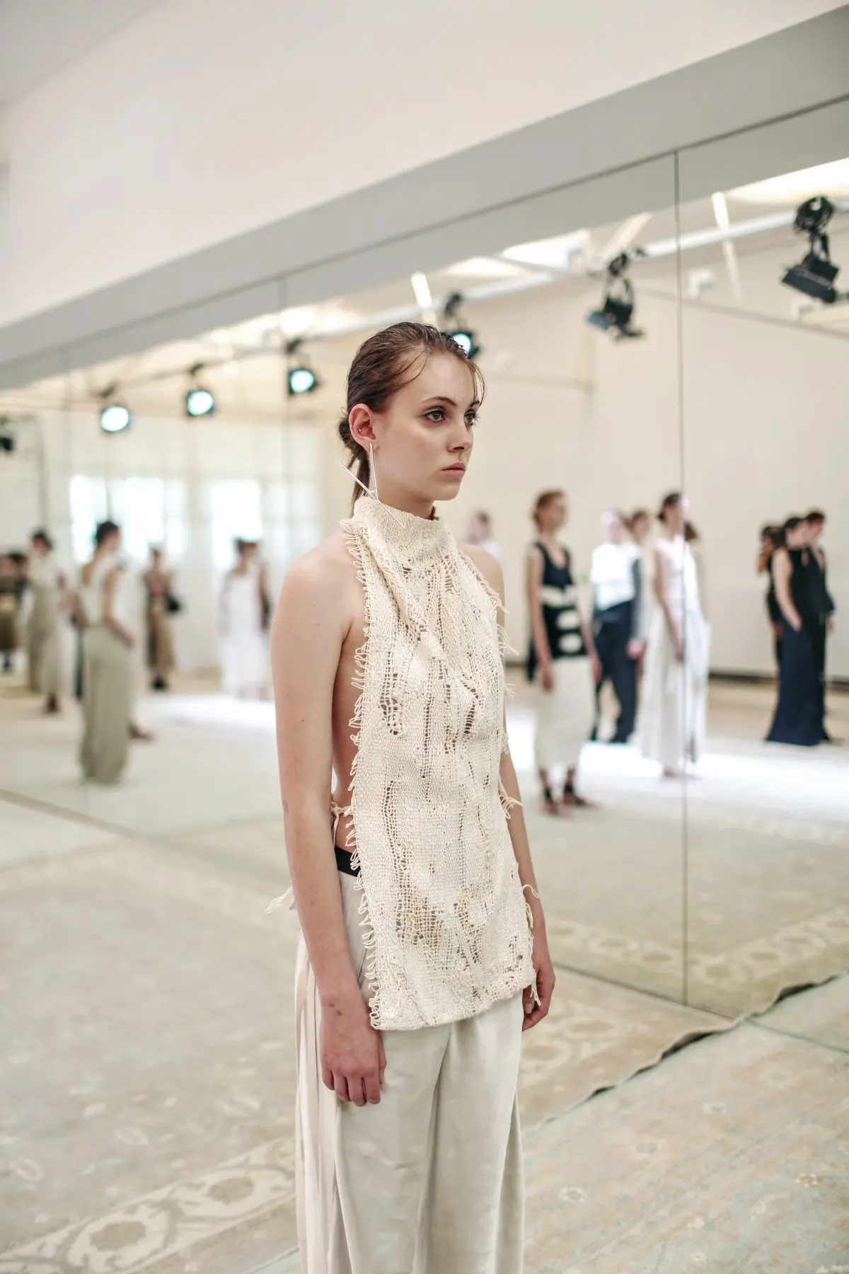 Sekali lagi jangan bayangkan koleksinya lantas akan terlihat seperti pakaian yoga. Tidak sama sekali, Fimelova. Tema gurun yang diambil tertuang lewat pemilihan bahan yang ringan, serta siluet yang loose. Warna-warna bumi (populernya, earth tones) yang hangat juga menjadi tekanan. Permainan detail seperti tali, jaring, dan simpul menjadi perhatian kami. Walaupun modelnya klasik, namun permainan detil tersebutlah yang menjadikan koleksinya istimewa.