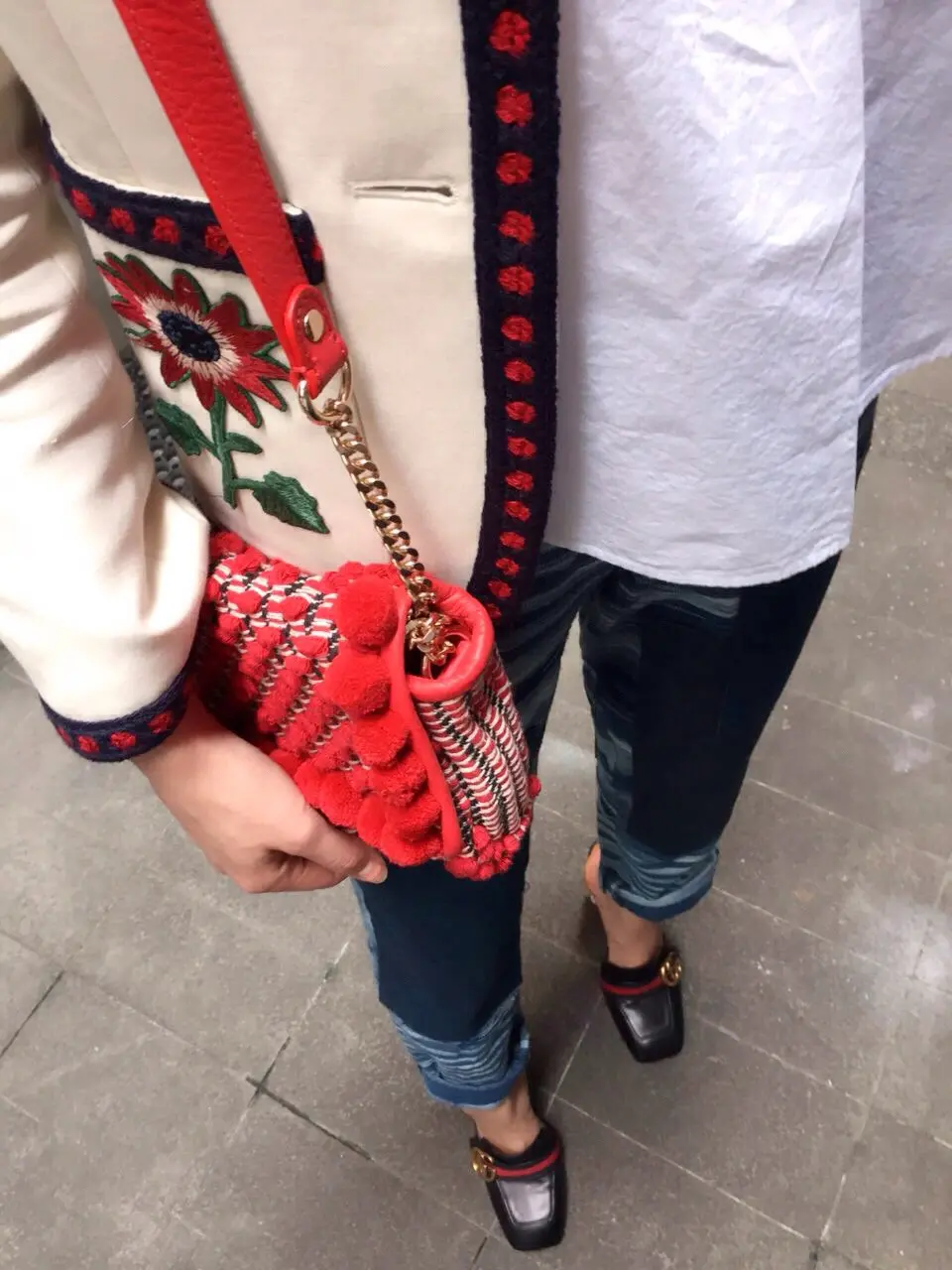 Kamu bisa memilih tas dengan aksen hippy dan dominasi warna merah jika kamu termasuk tipe perempuan yang enggan memakai outfitberwarna cerah. Namun untuk yang berjiwa adventurous, jaket embroidery dengan benang merah akan membuat gaya terlihat lebih meriah. Denim akan menjadi item yang meredam warna cerah tersebut sehingga tidak terlihat terlalu berlebihan, terutama jika kamu ingin mengenakannya ke kantor.
