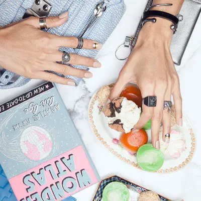 Wardrobe: Wonder Atlas Clutch Book, Olympia Le Tan @ROCOCO. Denim Tone Mini Paisley & Currency Wallet, Phillip Lim. Assorted Rings and Metal Bracelets, Atelier Pedra. Black Plastic Bangle, Klar @TheGoodsDept.