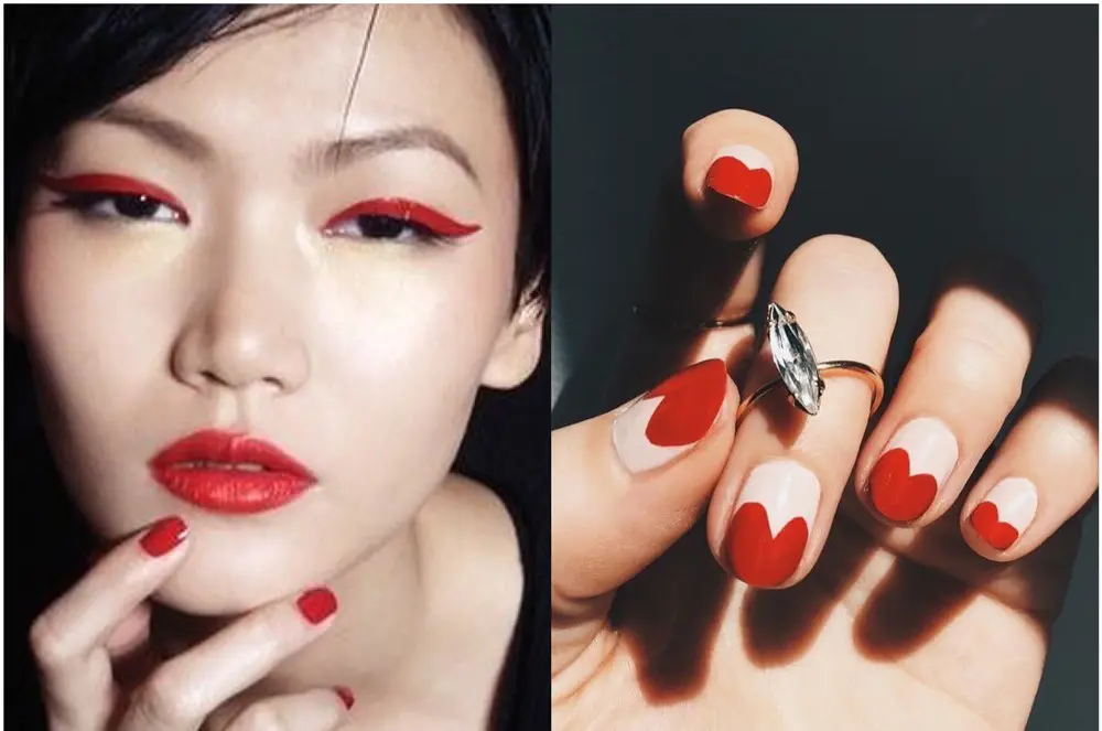 Maka eyeshadow pun, kini boleh saja berwarna merah. Mengapa tak dicoba dengan disesuaikan karaktermu? Tetapi, jika belum sepenuh hati mau mencoba, ya tidak apa-apa. Cukup berkreasi dengan cat kuku berbentuk hati ini dalam warna merah, untuk tampilan gaya tak biasa.
