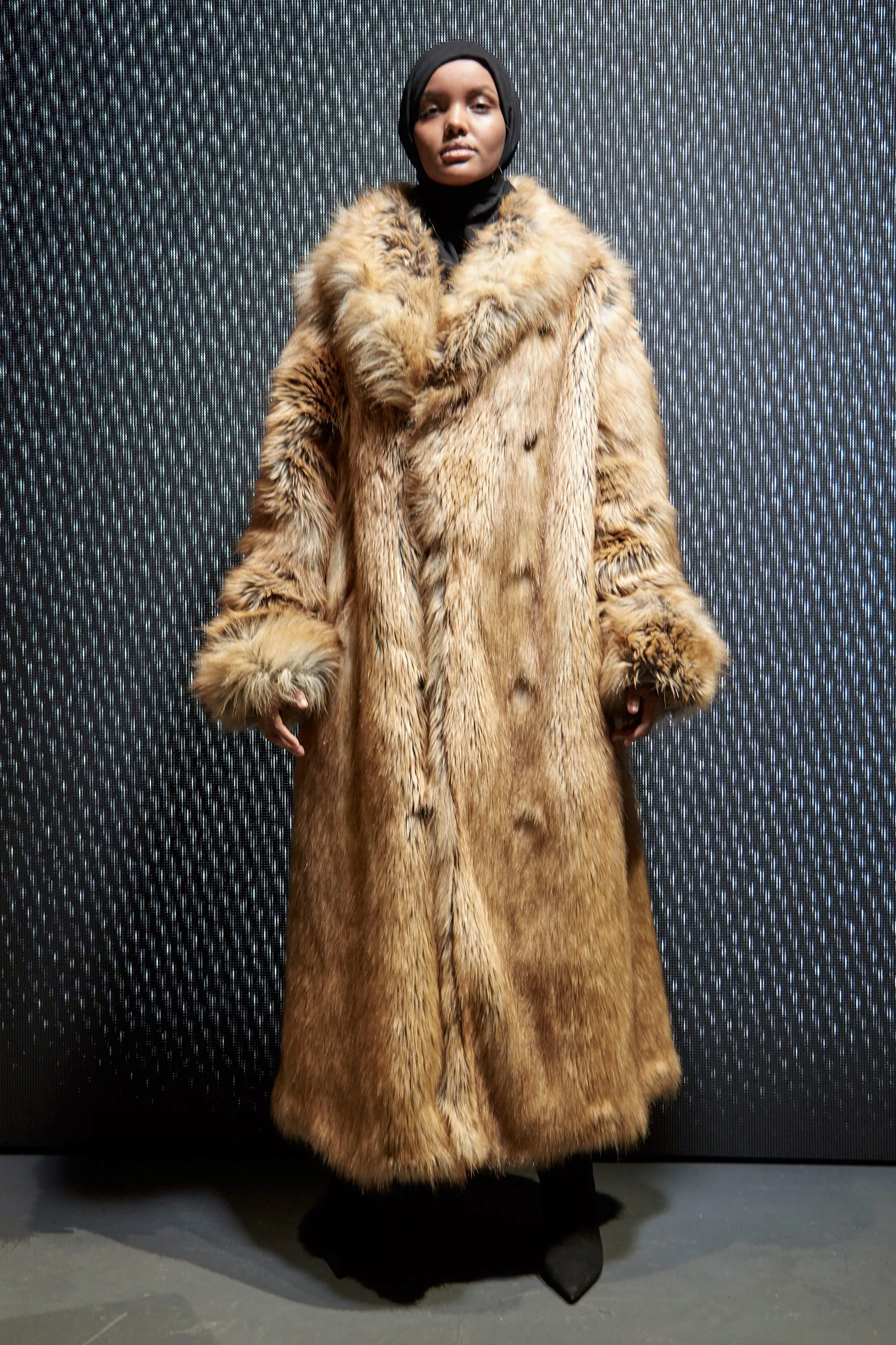 Sebuah mantel bulu oversized jatuh sampai ke pergelangan kaki, berwarna coklat terang bagaikan bulu singa, disertai detail pada bagian dada depan dan bagian ujung lengan yang terasa begitu agung dikenakan oleh seorang model Muslim Halima Aden lengkap dengan hijabnya. Berdarah campuran Somalia dan Amerika, Halima Aden dipilih menjadi salah satu model Yeezy musim ini. Berjalan dengan bangga-nya sambil mengenakan hijab, kharisma dari model yang pernah mengikuti ajang ratu kecantikan Miss Minnesota dengan hijabnya ini memberikan nuansa yang begitu eklektik pada koleksi Yeezy secara keseluruhan.