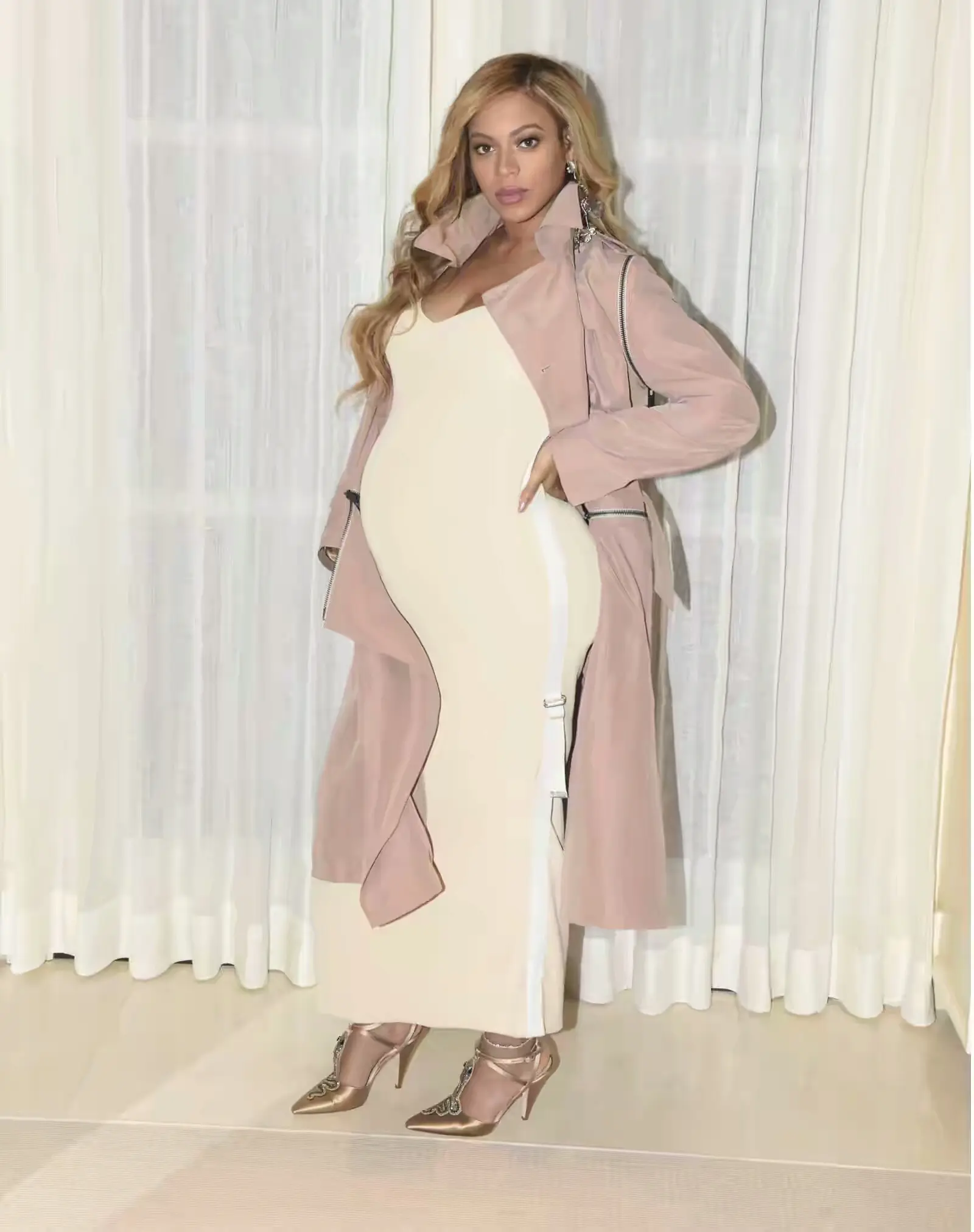 Beyonce memasang beberapa foto termasuk satu video yang berisikan gabungan beberapa foto kehamilannya setelah sebelumnya ia melakukan hal yang sama namun mengenakan gaun berwarna broken white dilengkapi dengan coat dusty pink yang super chic. Para fans fanatik-nya menangkap beberapa unggahan foto dengan outfit dua warna yang berbeda ini sebagai “kode” jenis kelamin si kembar.