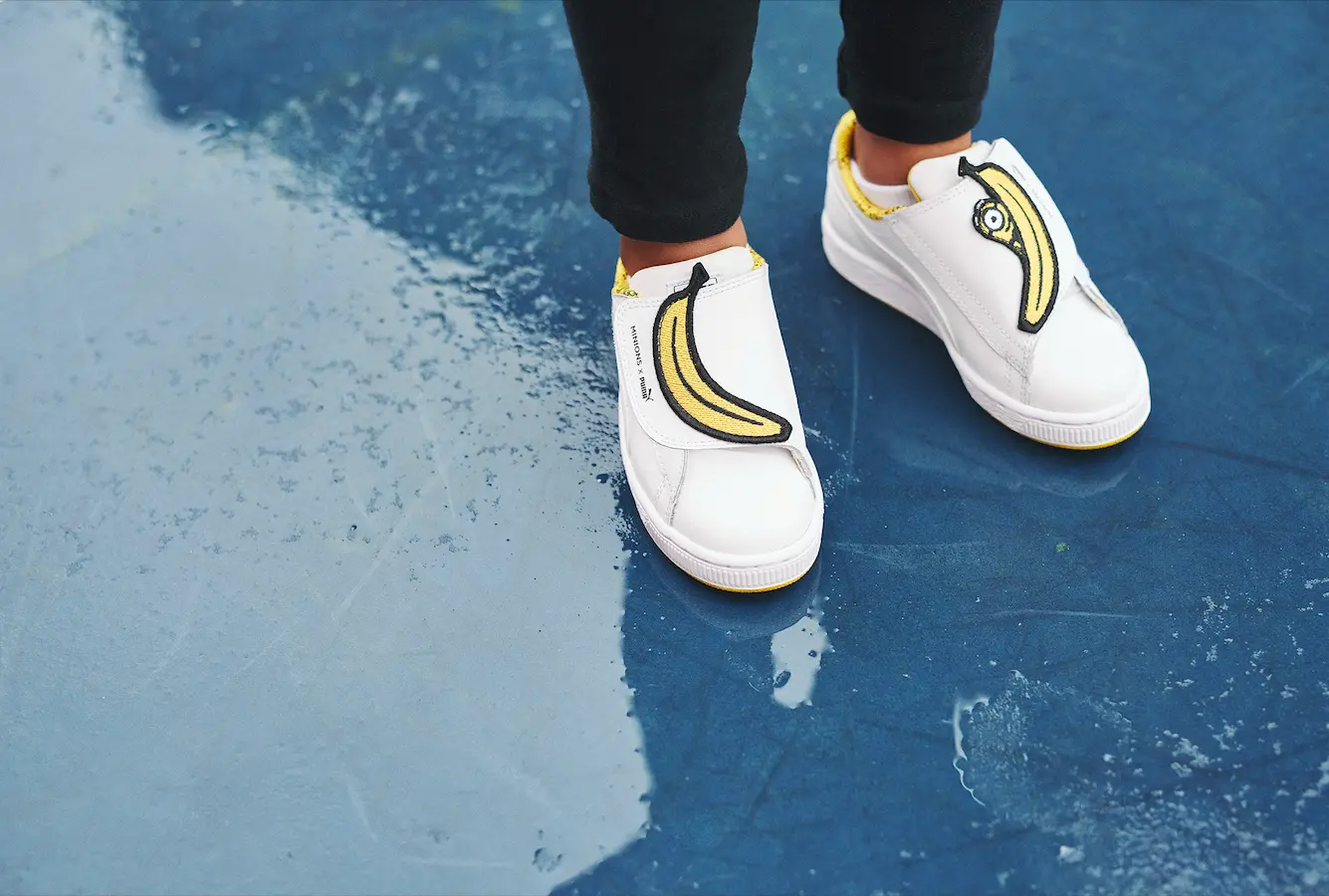 Koleksi yang menarik mata, karena bukan hanya deretan sepatu ikonik PUMA Basket yang dimodifikasi dengan ikon kacamata Minions saja, namun sweater kuning oversized dengan cetakan nama para Minion, Stuart, Carl dan Kevin dalam font Helvetica untuk kesan yang kontemporer dan mood street wear yang modern. Lengkap dengan ikon kacamata Minions di bagian belakang terlihat begitu modern PUMA x Minions ini juga menghadirkan kids collection. Mulai Track Jackets, Sweat Pants, Hoodies, Kaos, PUMA Basket sneakers sampai tas, hadir dengan modifikasi perpaduan warna kuning, ilustrasi Minion berwarna hitam putih dan motif pisang di bagian strap sepatu. Semua menonjolkan logo kolaborasi PUMA x Minions dan beragam grafis yang fun.
