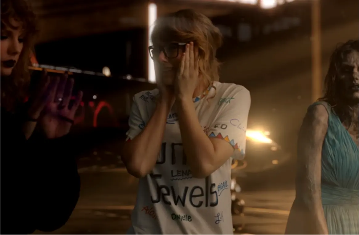 1. Dead Taylor. Taylor telihat erm.. menyeramkan? in this scene old Taylor rise from her grave, that's why Taylor terlihat seperti zombie dengan gaun biru oleh J.Mendel which she wore on her music video for "Out of the woods".