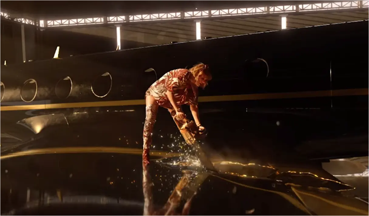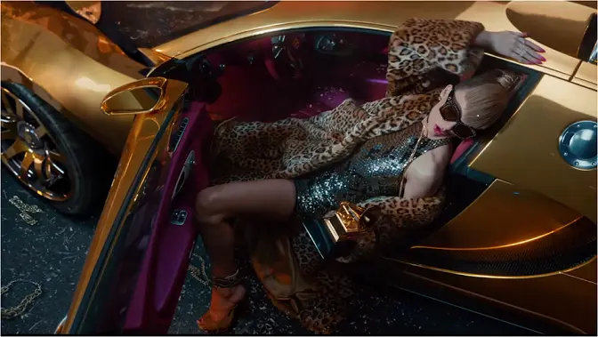 5. Jumper and thigh high boots. Untuk adegan perampokan bank, Taylor goes simple dengan hoodie dengan sequin motif singa dari Gucci dan again glossy magenta thigh high boots.