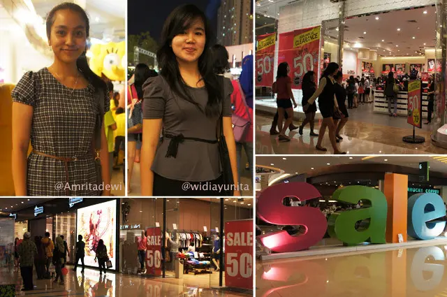 Ada pula Fimelova yang mengaku makin antusias mendatangi mall saat ada sale atau event seru lainnya yang memancing rasa penasaran mereka, seperti Ninit dan Iren, 27 tahun, karyawati. “Aku lebih suka nongkrong di coffee shop kalau malam libur, baru hari liburnya jalan ke mall bareng keluarga. Karena kebetulan ada sale dan dekat kantor ya sudah mampir dan lihat-lihat sebentar siapa tahu ada barang oke. Lumayan, kan. Sambil lihat firework-nya juga, nih. Katanya lumayan keren,” kata Iren. Ninit menimpali, “Sebenarnya males kalau harus bermacet ria begini, belum lagi susah parkirnya kalau lagi ada acara, tapi penasaran juga dengan sale-nya, jadi nggak apa-apa sekali-sekali. Biasa ke mall kalau sudah harus belanja bulanan atau pengen beli baju, nggak harus tiap weekend, tapi dibilang jarang juga nggak, sih. Abis, mau ke mana lagi coba? Ragunan jauh, sih! Hahaha.”