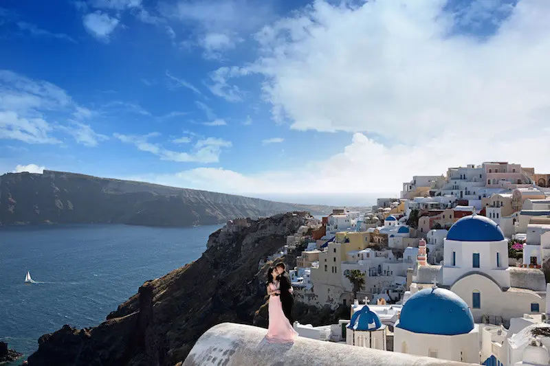Siapa yang tidak mengenal keindahan dari Santorini. Lokasi yang berada di Yunani ini benar-benar menawarkan pemandangan kota yang menawan. Dengan langit biru yang cerah serta bangunan-bangunan klasik khas Santorini, Efra menghasilkan foto pre-wedding panoramic yang unik.