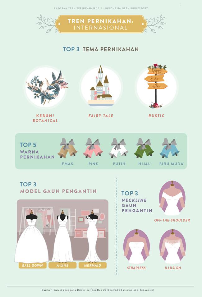 Untuk kamu yang memilih tema pernikahan internasional, beberapa hasil survey ini akan memudahkan kamu memilih lokasi foto pre-wedding hingga gaun apa yang masih menjadi tren di tahun 2017.