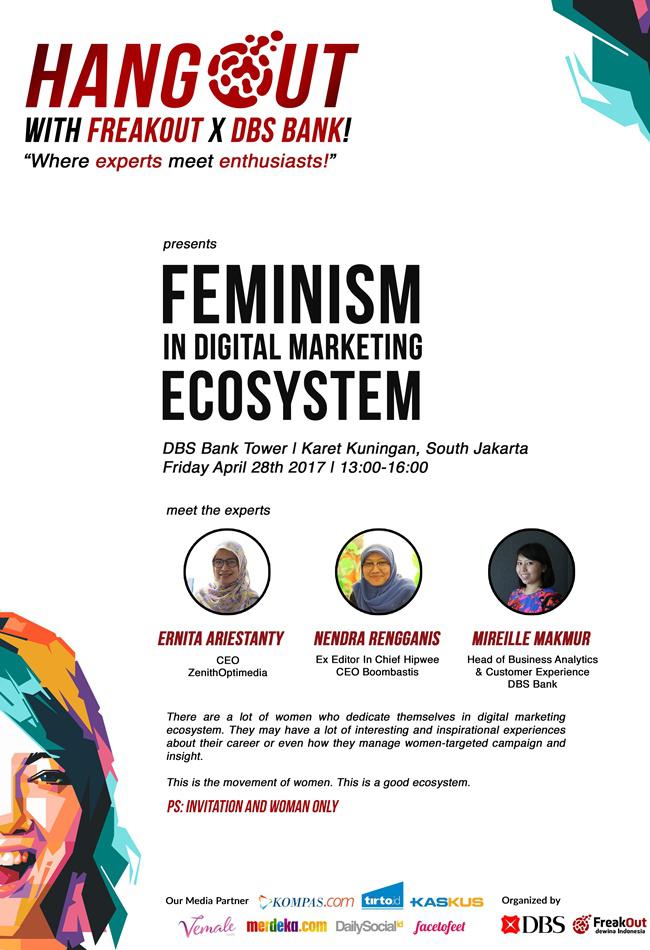 Bulan April ini, FreakOut dewina Indonesia kembali mengadakan event HangOut with FreakOut. Berkolaborasi dengan DBS Bank, kali ini tema yang diangkat adalah mengenai Feminism in Digital Marketing Ecosystem. Tema ini diangkat untuk membuktikan bahwa di dalam ekosistem digital marketing ada sosok-sosok Kartini yang menginspirasi banyak orang.